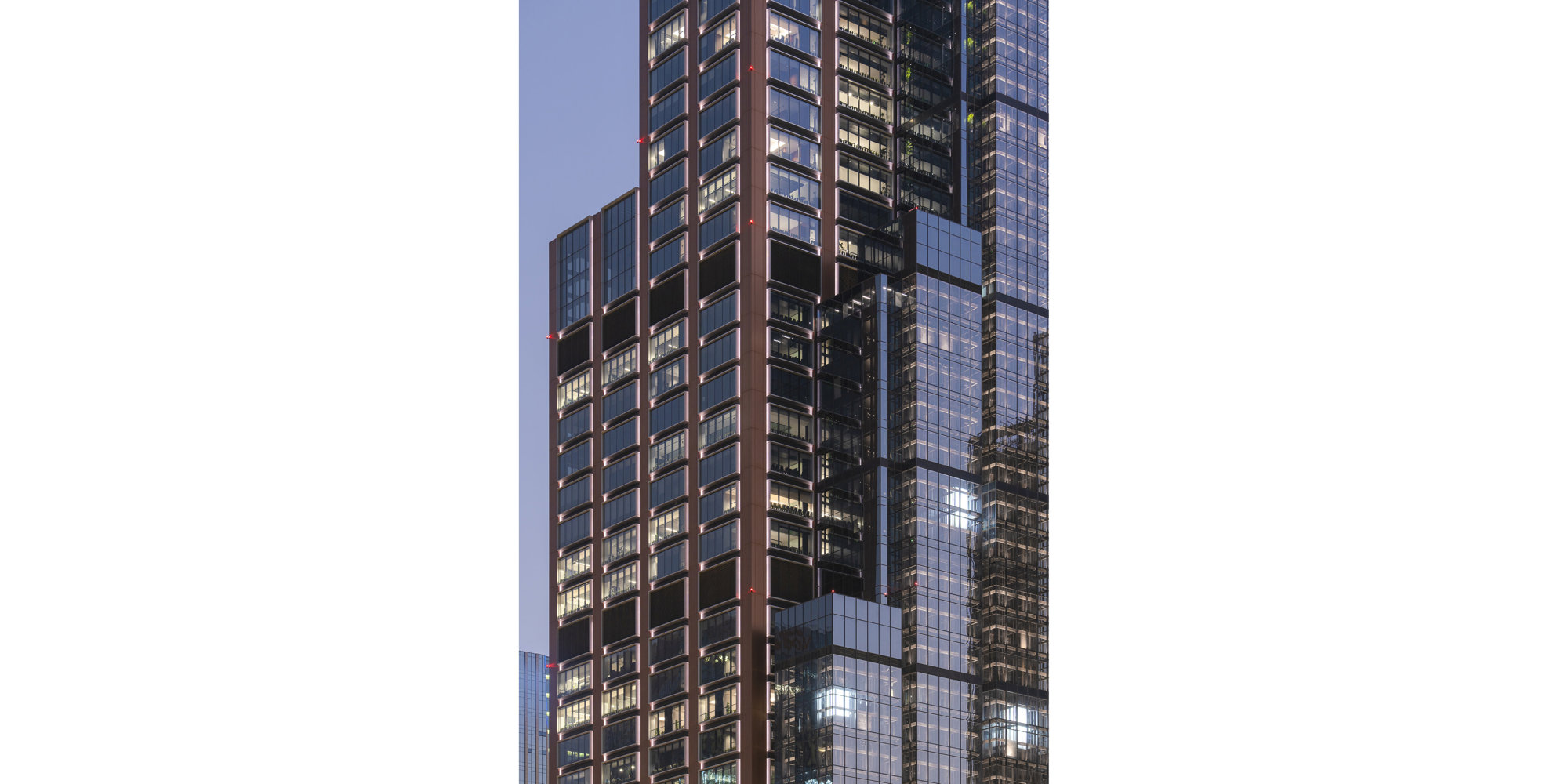 Placing the lift cores on the outside of the tower gives the structure a unique form and a flexible, open floorplate. This approach is an evolution of the conventional office layout, to allow more connectivity with the outside, whilst maximising views and daylight via large bay windows.